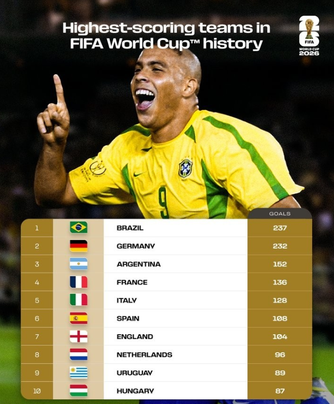 FIFA’s official social media account recently published a list of the top 10 national teams with the most goals scored in World Cup history. Brazil leads the ranking with 237 goals, closely followed by Germany in second place.