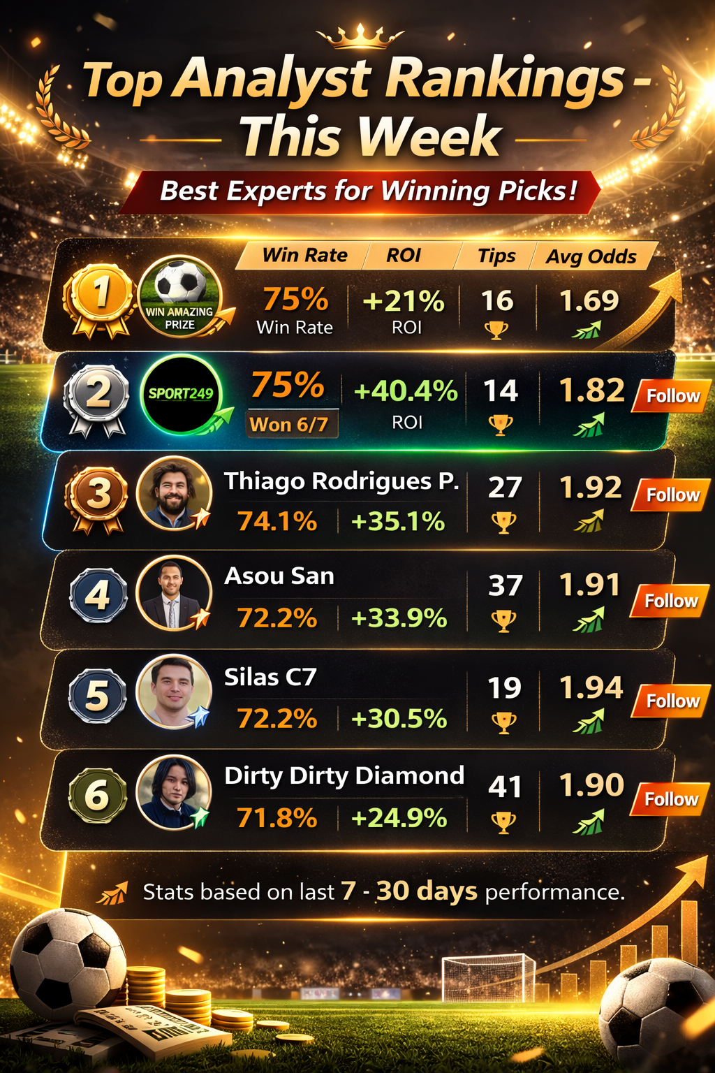 Win Amazing Prize takes the top position this week with strong consistency and solid returns. A 75% win rate combined with steady odds makes this analyst a reliable option for disciplined bettors.